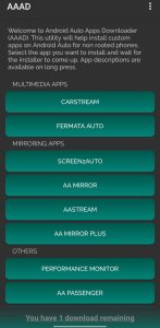 With the help of the AAAD App, you can install third-party applications to Android Auto. Download CarStream, Fermata Auto, Screen2Auto, AA Mirror, AAStream, AA Mirror Plus, Performance Monitor, AA Passenger, Widgets For Android Auto, and NAV2Contacts.