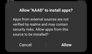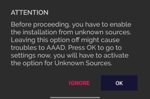 - An Alert will appear on your screen, asking you to allow the App to install Apps from Unknown Sources. Tap on OK.